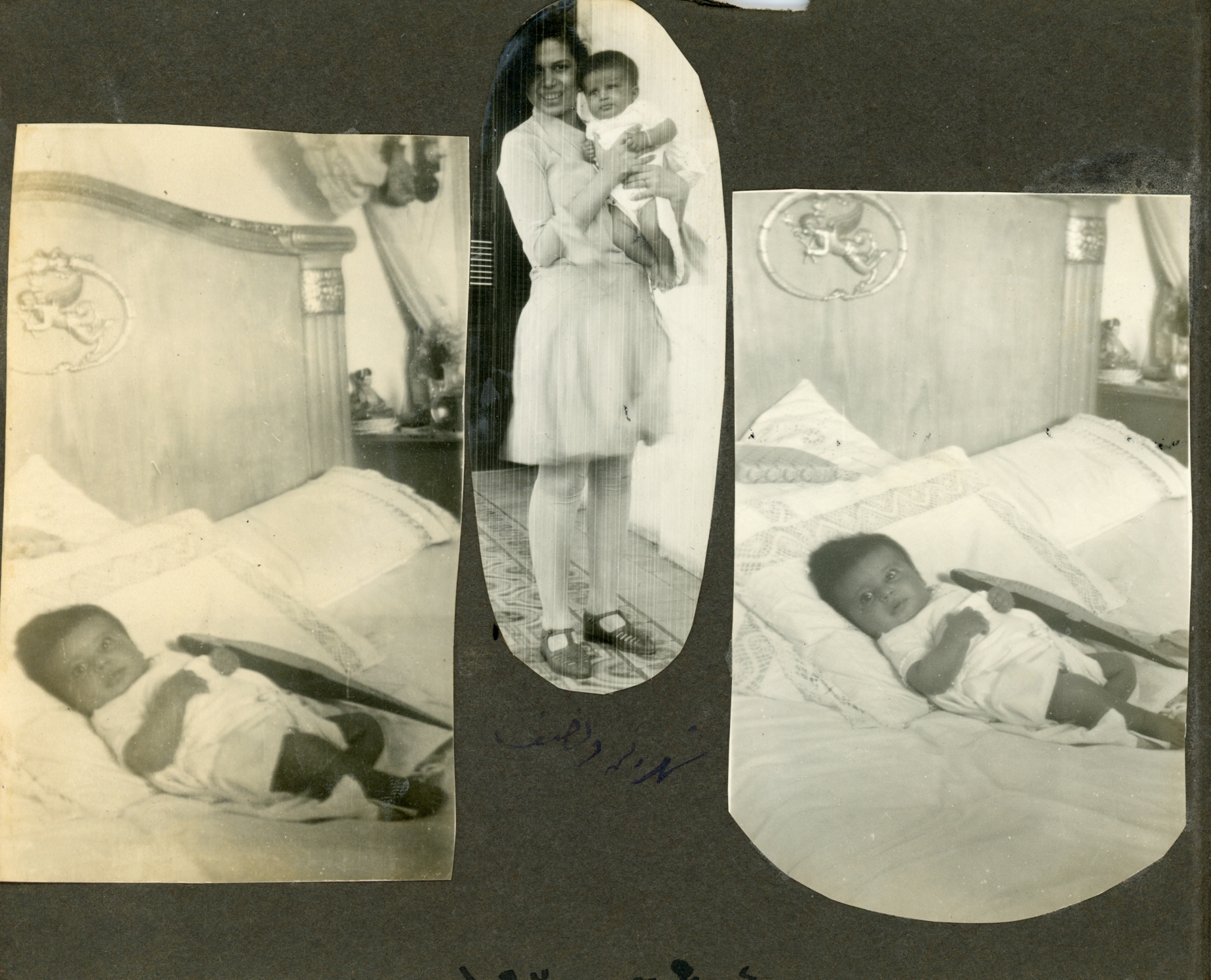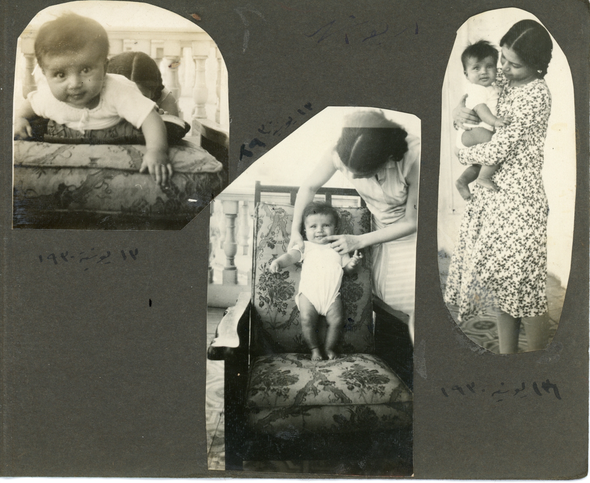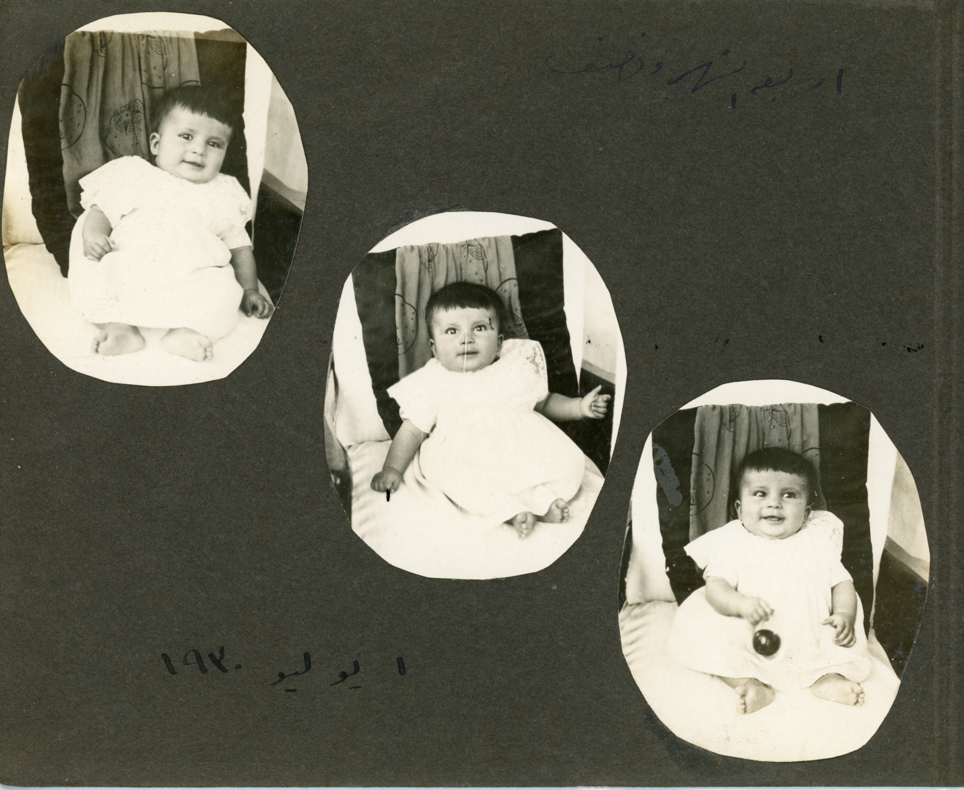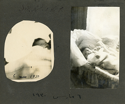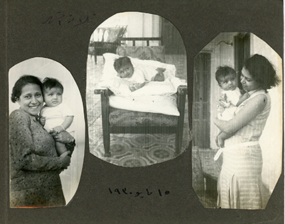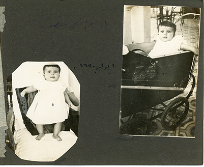 Small photo album. Monochrome sepia-tone photos from when Guli was a baby. Some note in Arabic.