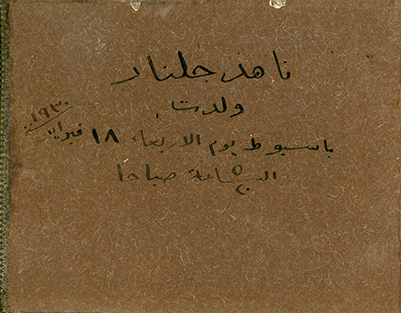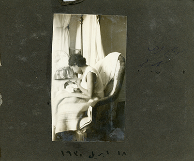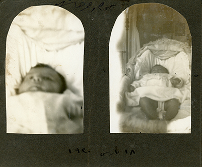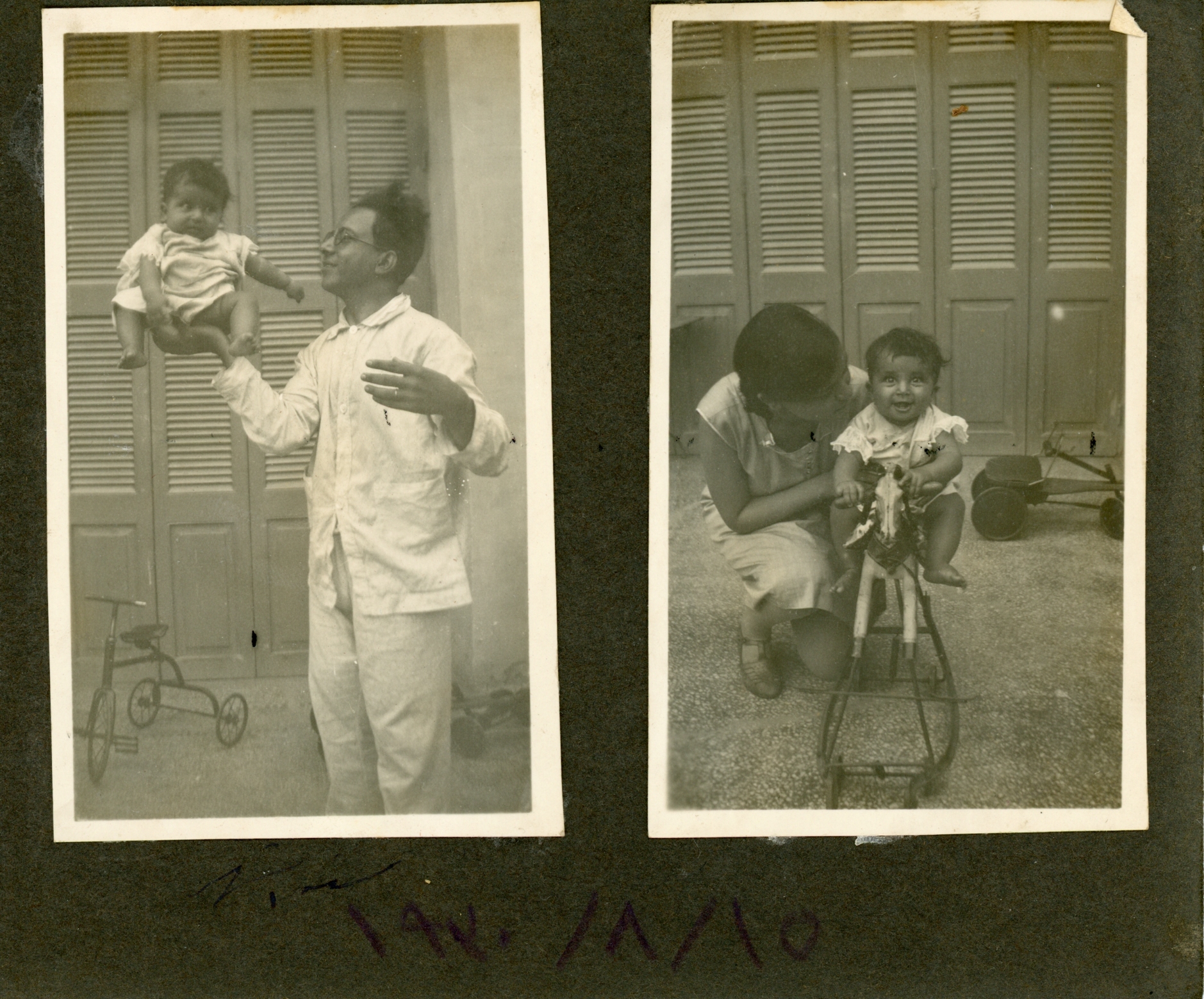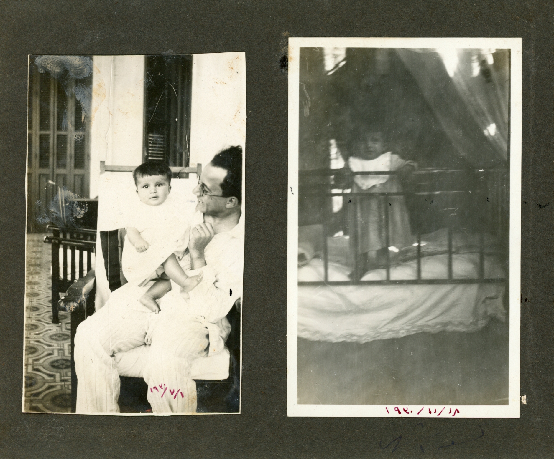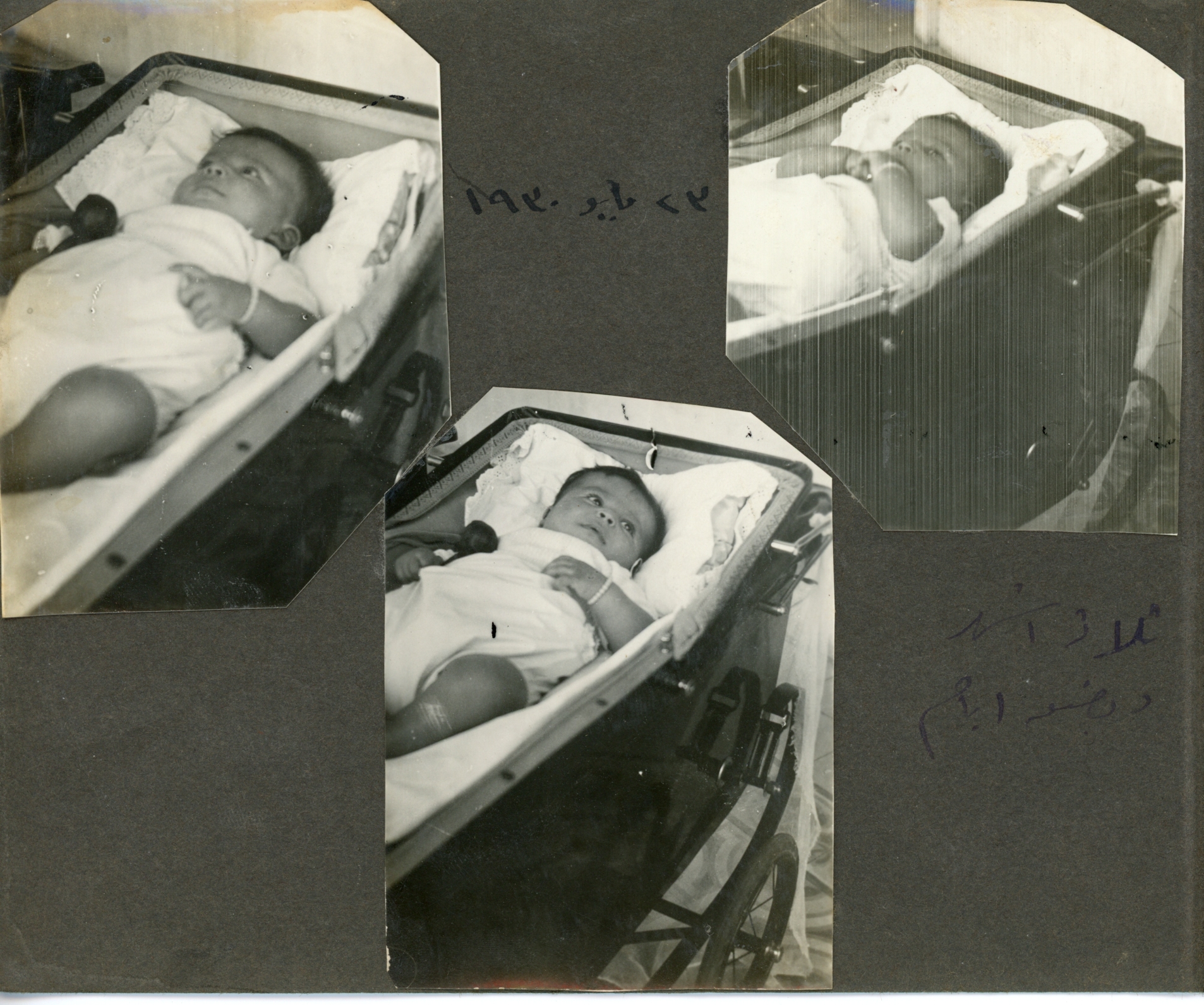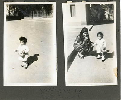 Small photo album. Monochrome sepia-tone photos from when Guli was a baby. Some note in Arabic.