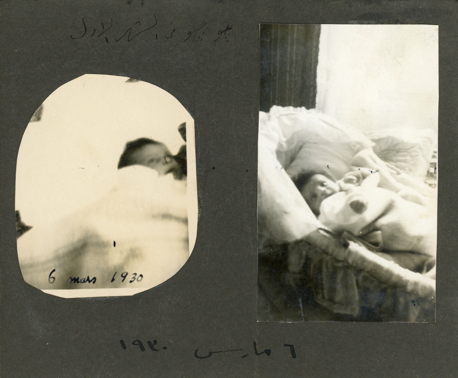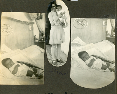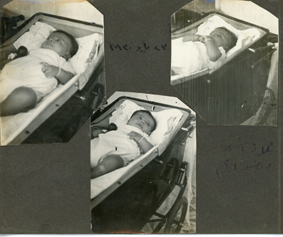 Three photos. Two of baby in bed, one unidentified girl holding baby. Date unclear, could be in April 1930. (Edge cut off in scan, consider rescanning)