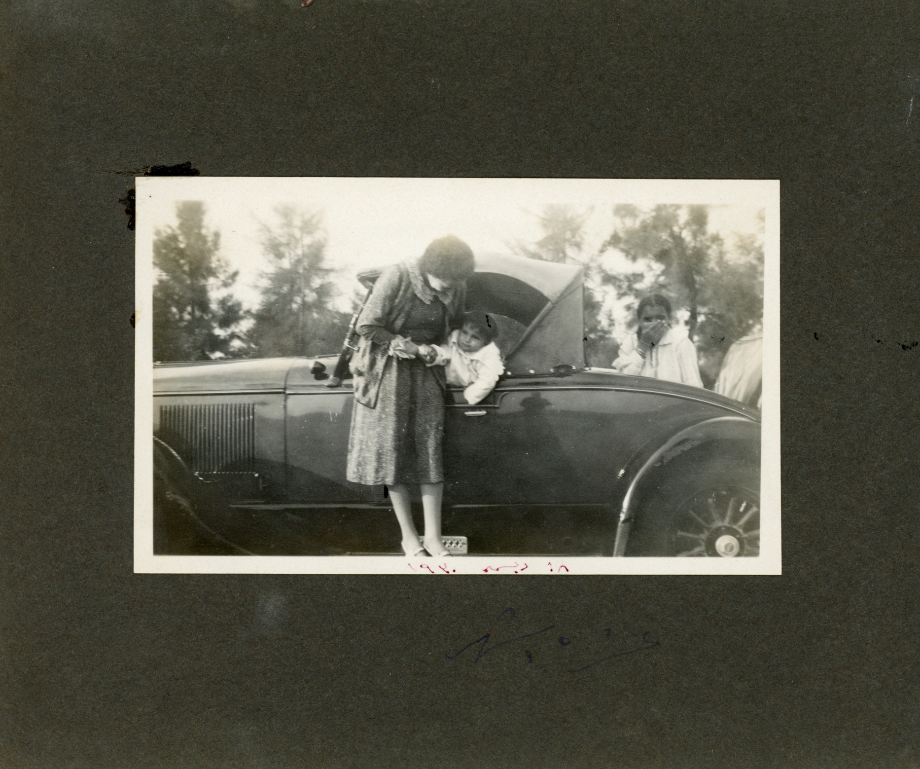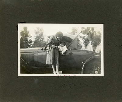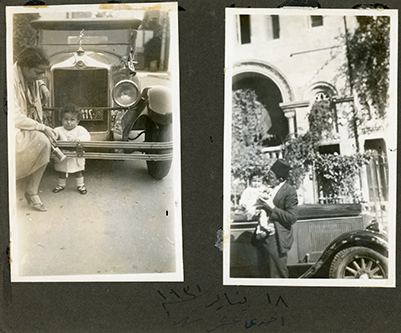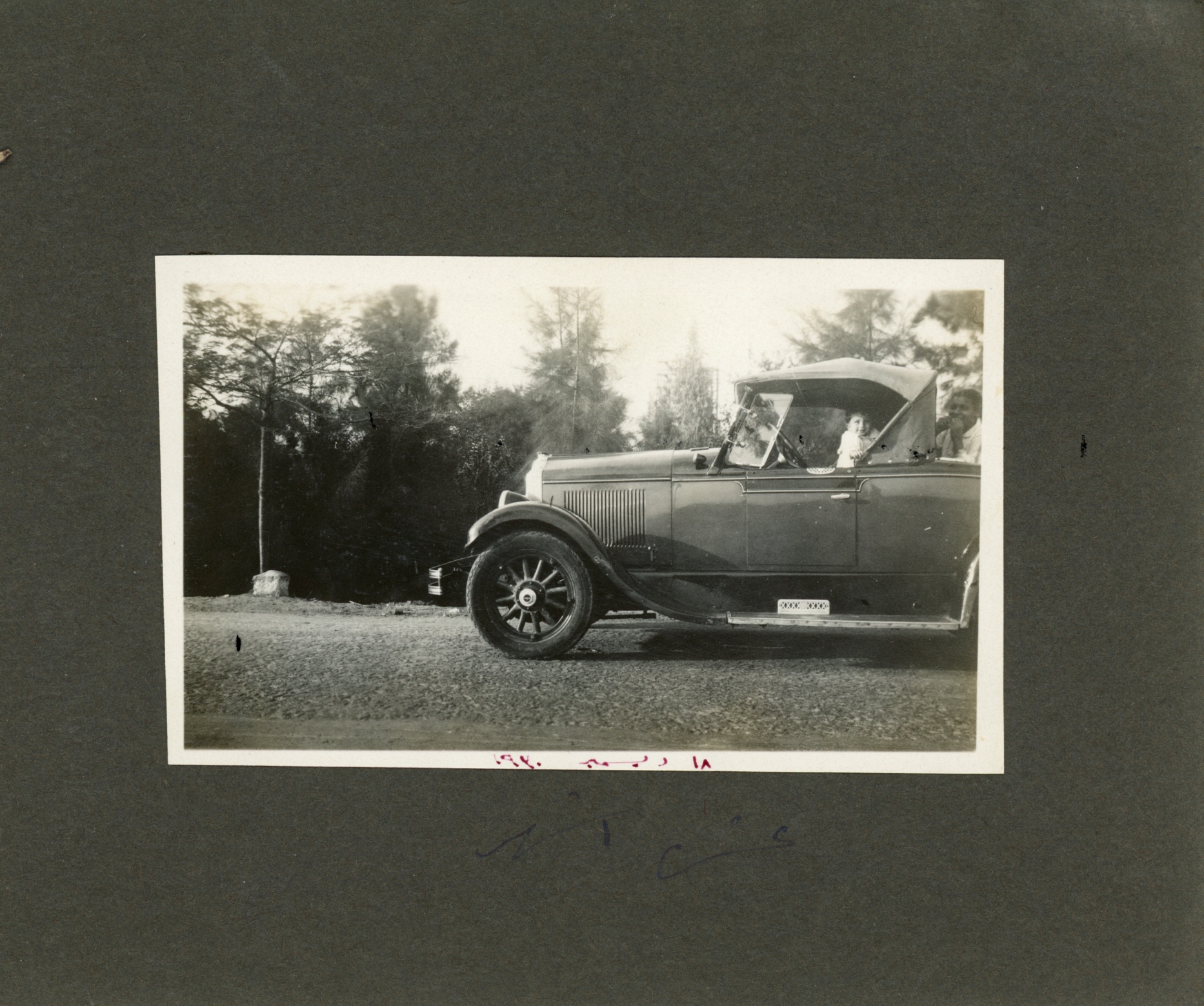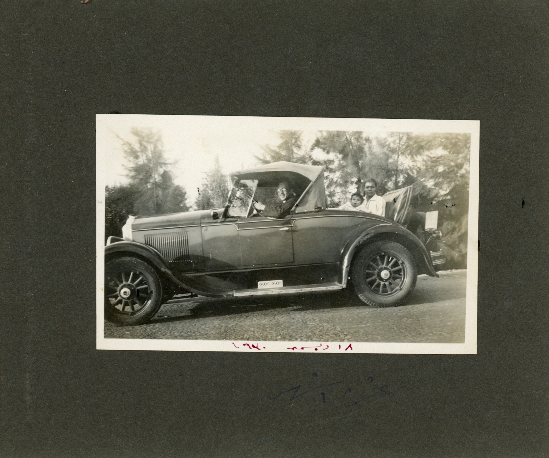 Hassan behind the wheel of a convertible car, with woman and baby Guli in rumble seat. It appears to be a late 1920s Chrysler Imperial. Date needs to be checked.