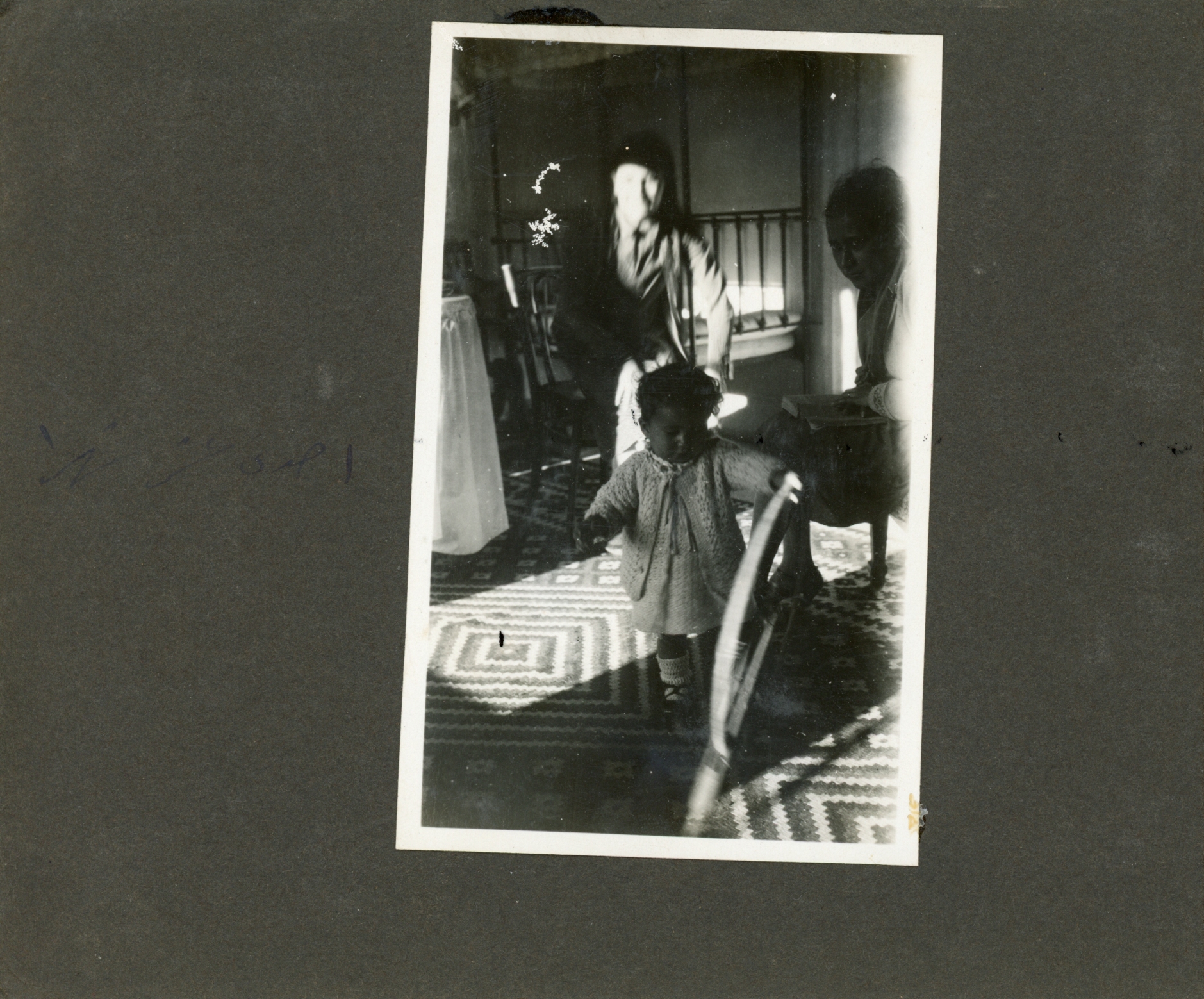 Guli standing on a rug in a room. Blurry figure of adult in background. No date noted.